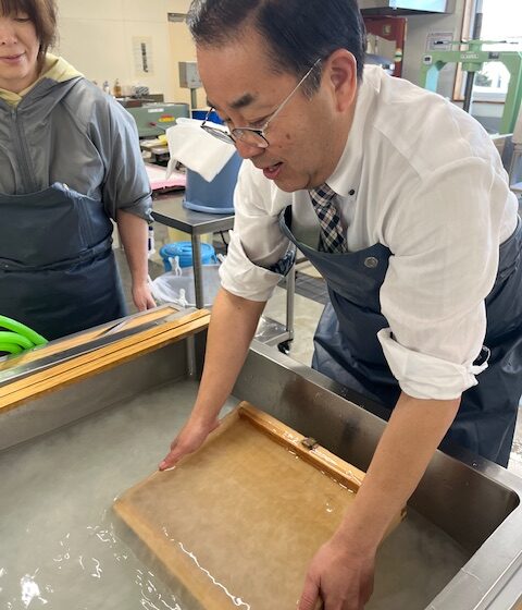先日、釧路市音別町にて伝統的な和紙作りを体験してきました。 写真に写っているのは、真剣な表情で「紙漉き(かみすき)」に挑戦する弊社の代表です。